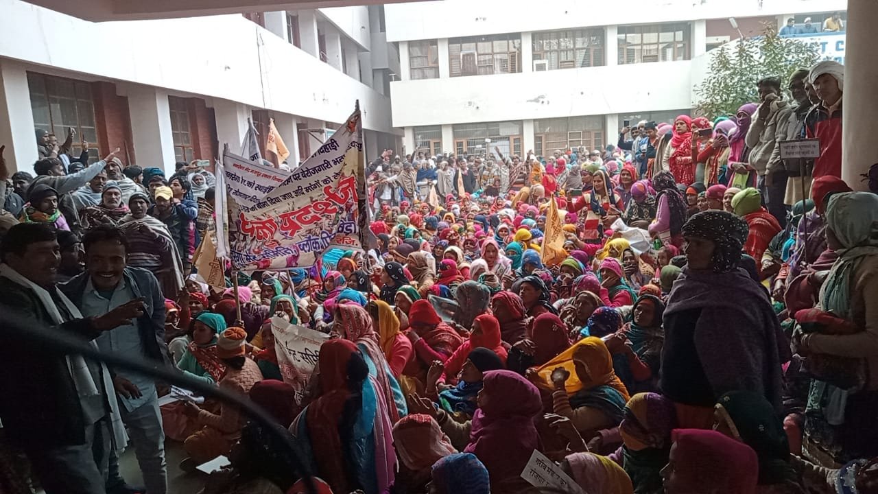 Jind News । ब्यूरो रिपोर्ट :सुरेंद्रपाल सिंह । मनरेगा मेट व मजदूरों ने जिला जींद हरियाणा में अपनी मांगों को लेकर पूरे जिला जींद के मनरेगा मेट व मजदूरों ने विशाल धरना प्रदर्शन करते हुए रोष व्याप्त किया मजदूरों को पूरा साल काम देने, समय पर मजदूरी का भूगतान करने, मनरेगा मजदूरों को बीपीएल सूची में शामिल करने , मजदूरों को इंदिरा आवास योजना के अंतर्गत प्लाट और आवास देने , मजदूरों की दिहाड़ी 800 रूपए करने, काम करने के दौरान यदि मजदूर को चोट लगती है तो उसे 2 लाख रूपए यदि काम करने के दौरान यदि मृत्यु हो जाती है तो मजदूर को 25 लाख रूपए लागू करने और देने, यदि अब N M M S में मजदूरों की हाजिरी रजिस्टर नहीं होती है । तो उसे मैन्यूल या फिर दफ्तर कर्मचारी के उसकी मोनिटरिंग करके उसे लागू करे और मजदूरों को साइट से वापिस ना लौटना पड़े, ब्लाक स्तर पर मजदूरों को दफ्तर से आ रही दिक्कतों का निदान हो ।
